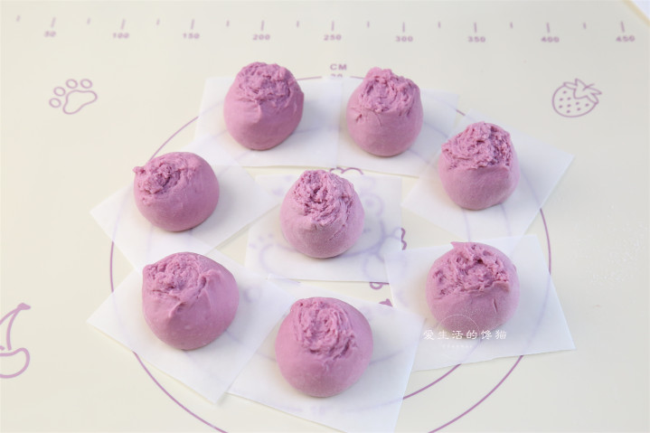 取一份起来搓得稍长一些,再从中扭断,断口处不要碰,朝上放置,可以在断口处放一些紫薯泥,醒发15分钟。