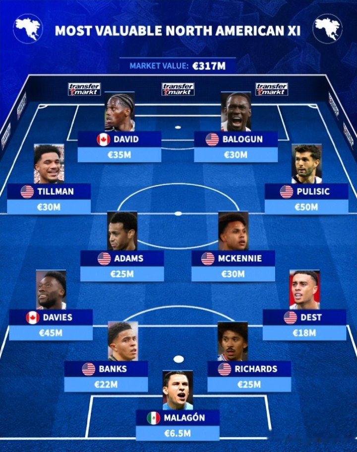 好意思国队在边路雷同占据主导:左边是马利克·蒂尔曼(3000万欧元),右边是队内身价最高的球员普利西奇(5000万欧元)。锋线由加拿大的乔纳森·戴维(3500万欧元)和好意思国的福拉林·巴洛贡(3000万欧元)领衔。