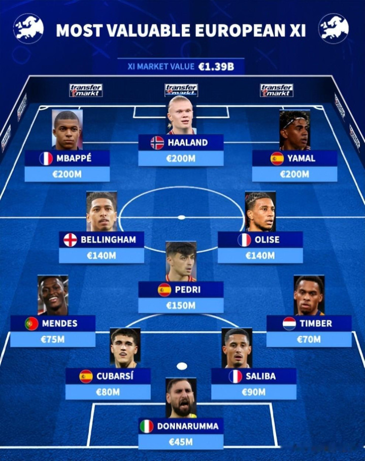 中场三人组由西班牙的佩德里(1.5亿欧元)领衔,他身前是英格兰的贝林厄姆(1.4亿欧元)和法国的奥利塞(1.4亿欧元)。