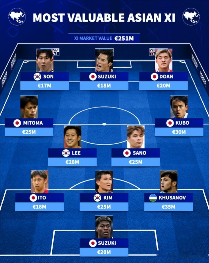 锋线三叉戟由韩国据说孙兴慜(1700万欧元)领衔,身边是日本的铃木唯人(1800万欧元)和堂安律(2000万欧元)。