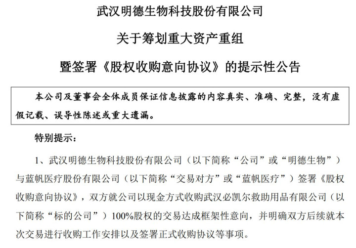 此前的2025年12月30日,明德生物宣布,公司已与蓝帆医疗签订《股权收购意向协议》,计划以现金形式收购武汉必凯尔救助用品有限公司100%股权。交易完成后,武汉必凯尔成为明德生物的全资子公司。