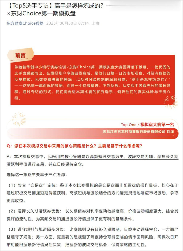 华创证券一直致力于从研究到投资交易,从利率到信用,从一级到二级等多个维度,为客户提供综合金融服务。今年二季度以来,债券市场趋势行情趋于尾声,市场呈现出复杂的震荡特征,波动相应加剧。在此背景下,机构投资者普遍面临策略有效性下降、操作窗口收窄的挑战,对短线交易能力的训练需求显著提升。我部将继续通过开展模拟盘短线特训的方式,协助机构适应新阶段的交易环境,开云app加强交易框架与风控体系建设。