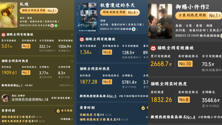另外开播的新剧《轧戏》《秋雪漫过的冬天》《御赐小仵作2》也各有各的亮点。
