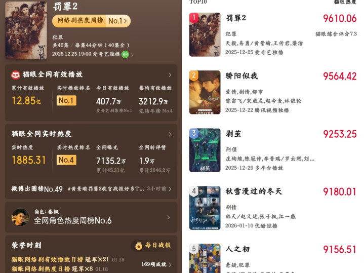然后是《罚罪2》完播,热度冲上猫眼网络剧热榜第1,还有排在第3的《剥茧》也不错。