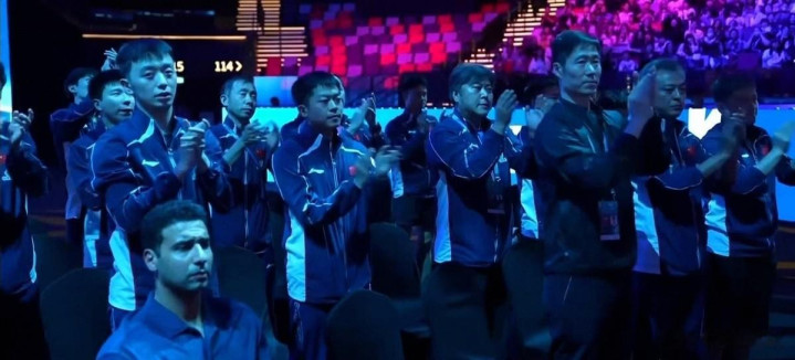看台上的王励勤起立饱读掌,那一刻像一枚定海针