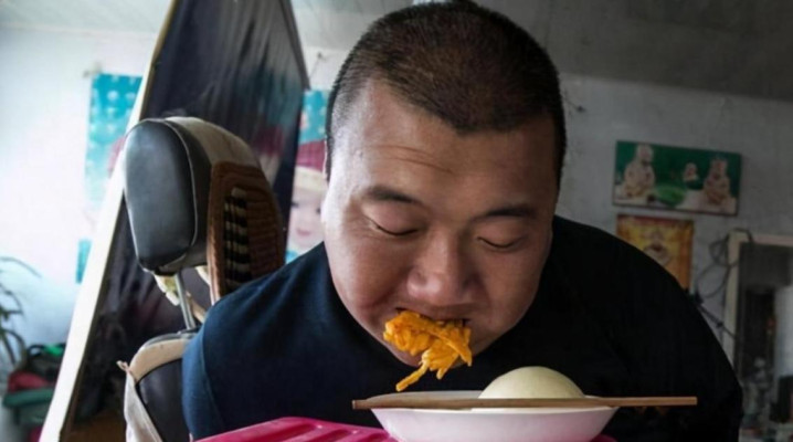 因为没有双手他学会用嘴“握筷子”即使嘴角被磨破还依然每天练习。