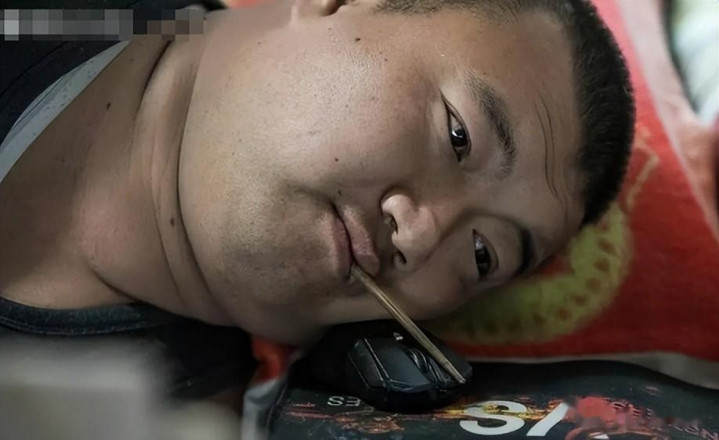 没有四肢的仅他靠着嘴巴和筷子操控着键盘和鼠标打游戏。