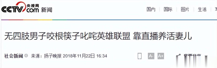 扬子晚报——无四肢男子咬根筷子叱咤英雄联盟 靠直播养活妻儿