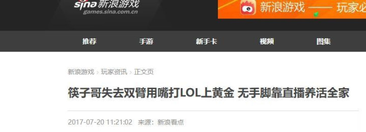 新浪看点——筷子哥失去双臂用嘴打LOL上黄金 无手脚靠直播养活全家
