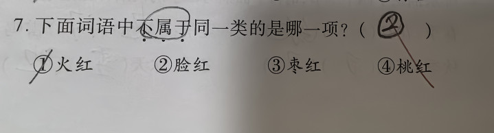 昨天女儿拿着试卷让我签名,看了孩子的试卷,发现只有一道很简单的题目错了。“火红、脸红、枣红、桃红”,这4个词语当中,哪个不是同一类?女儿的答案竟然是“火红”。