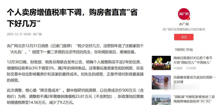 战略红利握续落地,财政部和税务总局蚁集公告,从本年一月起,个东说念主出售不及两年住房的升值税率从百分之五降到百分之三,满两年住房销售免征升值税,北上广深一都纳入范围,这径直减少来去本钱,一套三百万元屋子能省下六万元税费。