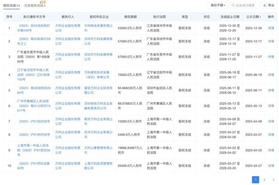 另外,万科企业还存在14起股权冻结事项,均发生在2025年,对应股权数额合共约27.58亿元,案件集中在广东省、湖南省、辽宁省、江苏省以及上海市。