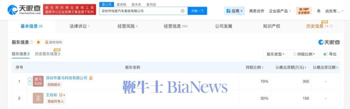 股东信息显示,该公司由深圳市喜马科技有限公司、王自如分别持股70%、30%。