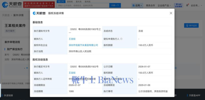 1月19日,天眼查天眼风险信息显示,近日,王自如新增一则股权冻结信息,股权所在企业为深圳市悦宸汽车美容有限公司,冻结股权数额150万人民币,冻结期限3年,执行法院为广东省深圳市南山区人民法院。