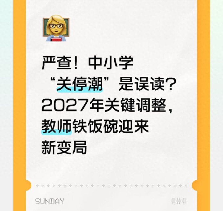 近期,“中小学将迎关停潮,2027年影响最大,教师铁饭碗不保”的说法在网上热传,不少家长和教师忧心忡忡。但真相并非如此,所谓“关停潮”是对教育资源优化政策的片面解读,2027年确实是基础教育布局调整的关键年份,而教师的“铁饭碗”也不是被打破,而是迎来结构性优化的新变局。今天结合权威政策和数据,把这件事的来龙去脉讲清楚。