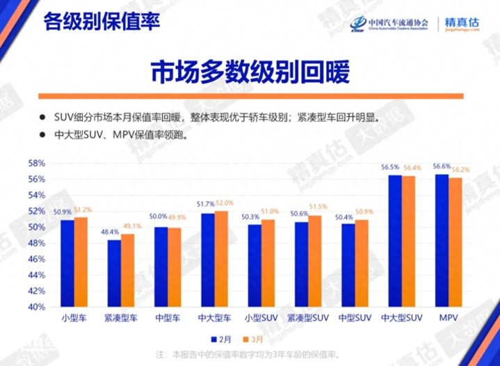 先看大盘。3月各级别三年保值率里,中大型SUV依旧最稳,达到56.4%,MPV也有56.2%。这讲明一个很执行的问题:高需求、强家庭属性、兼顾商务和出行场景的车型,二手市集更吃香。 反过来看,中型车诚然体量不小,但保值率唯有49.9%,讲明这个级别刻下夹在新动力冲击和奢靡升级之间,压力不小。